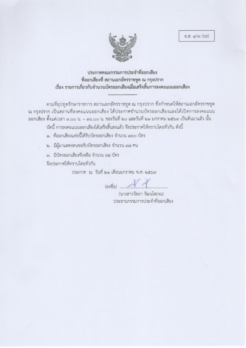 ประกาศรายการจำนวนบัตรออกเสียงฯ เมื่อเสร็จสิ้นการลงคะแนนออกเสียง