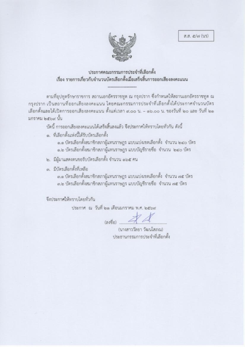 ประกาศรายการจำนวนบัตรออกเสียงฯ เมื่อเสร็จสิ้นการลงคะแนนออกเสียง